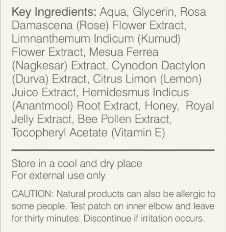 Гидролат дамасской розы, индийский болотник, мезуя железная, cвинорой пальчатый, сок лимона, экстракт корня сассапарильи индийской, мед, маточное молочко пчелиное, экстракт пчелиной пыльцы, токоферол ацетат (витамин Е), оливковое масло, феноэксиэтанол (2Phenoexyethanol) 0.5%, органическая глицериновая основа (Base QS).